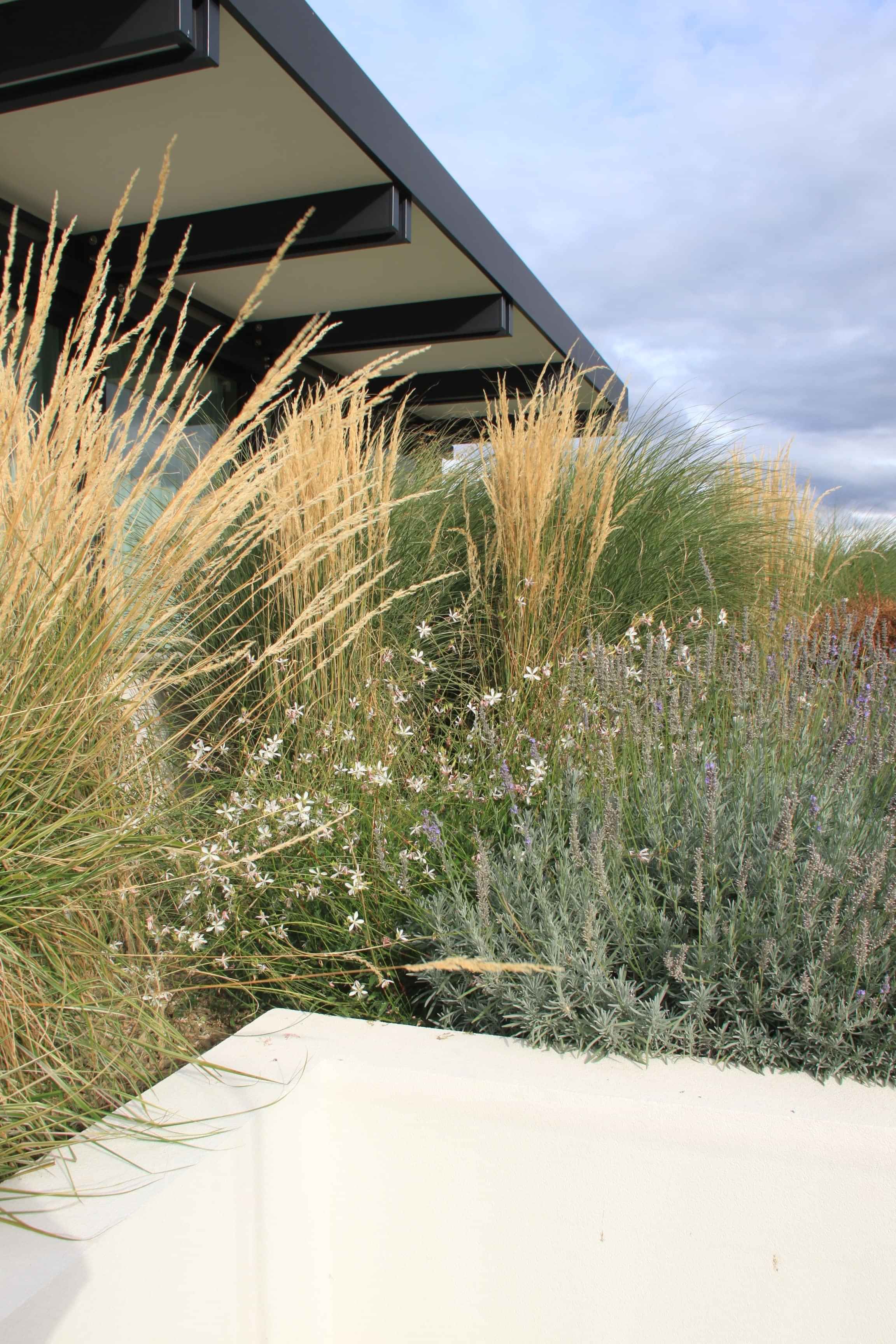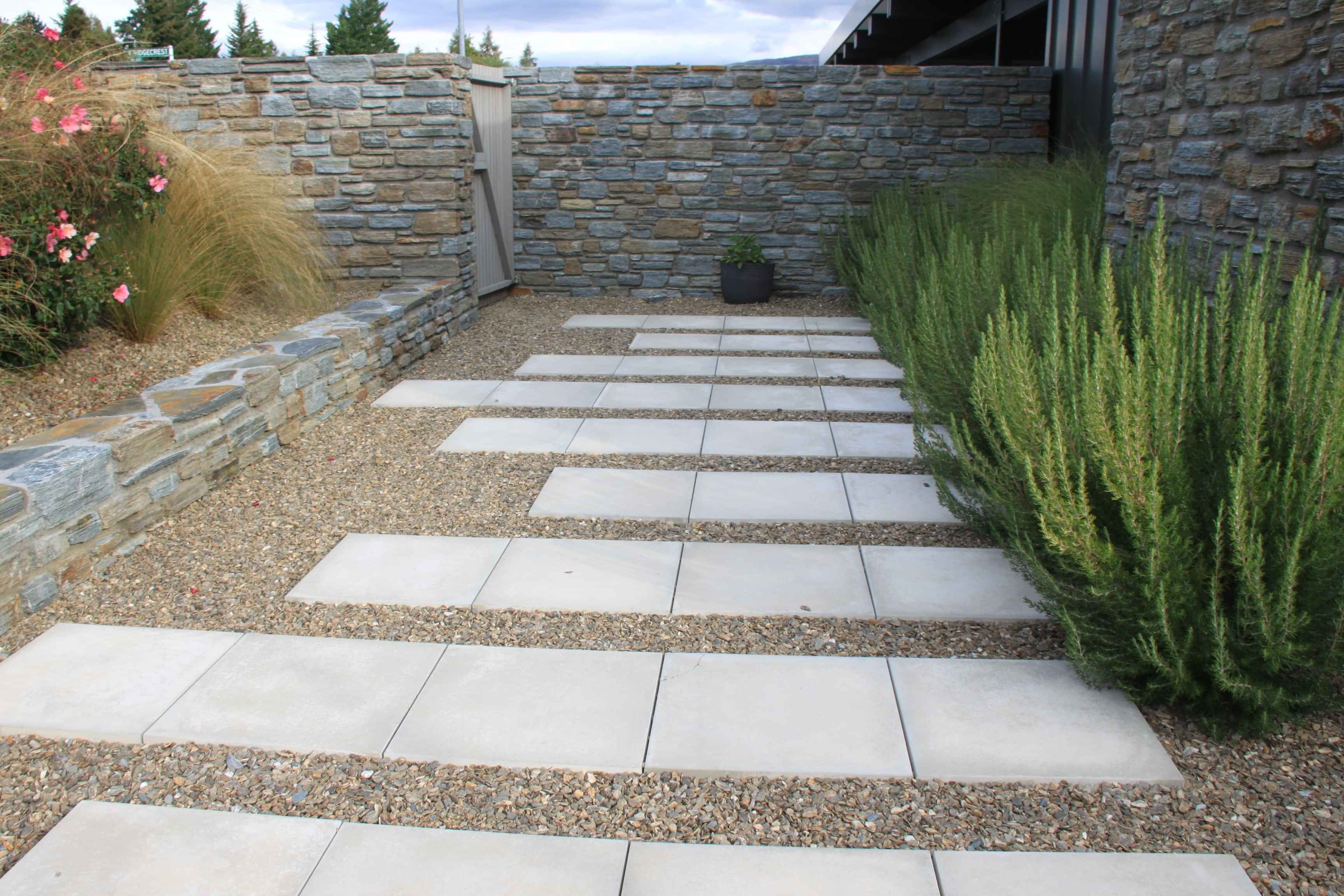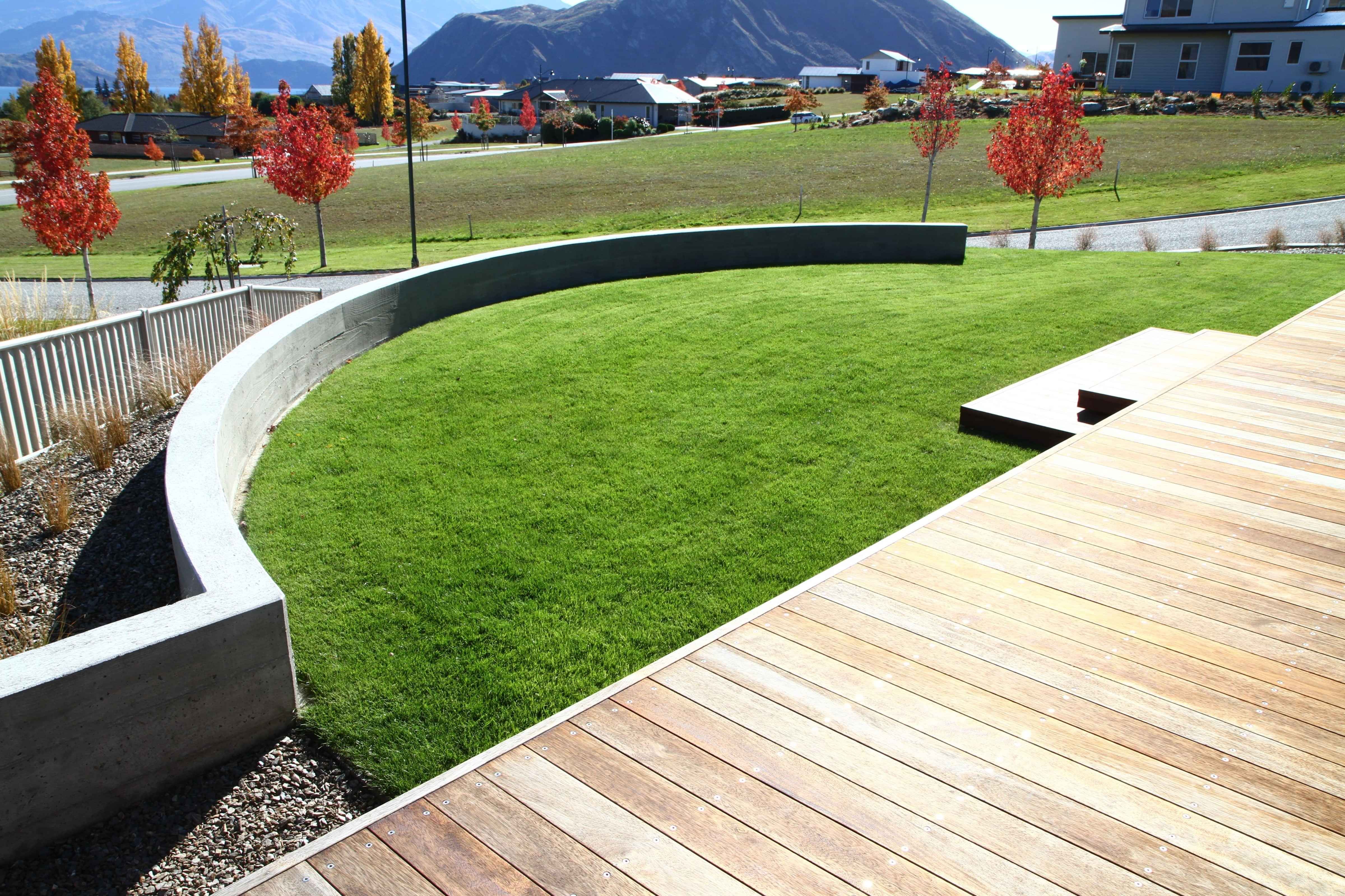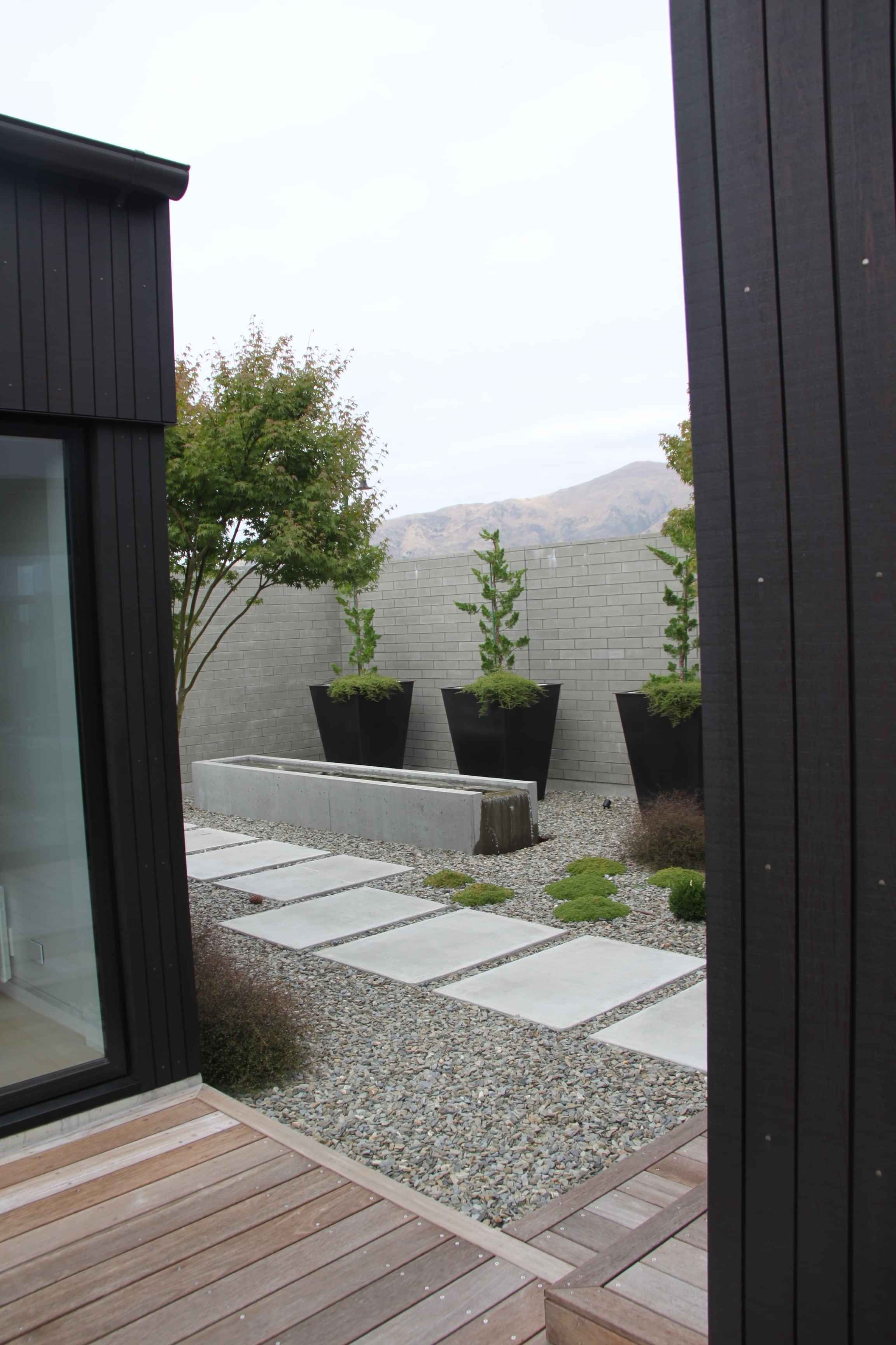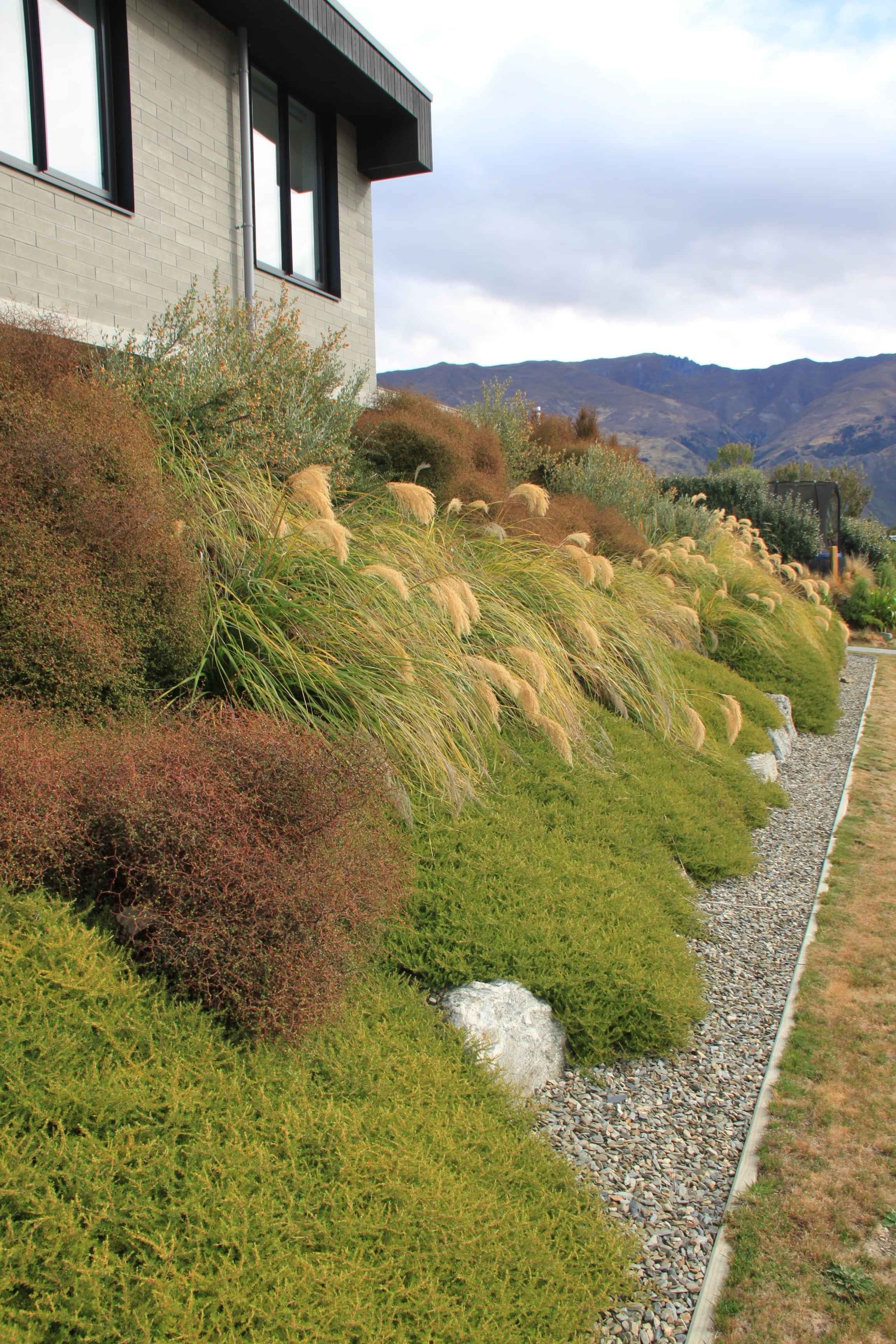 This Mason and Wales designed house includes a central courtyard and surrounding garden with views down to Lake Wanaka. The plant selection used is a mix of native and exotic plants to settle it into the surrounding neighbourhood and wider landscape beyond.