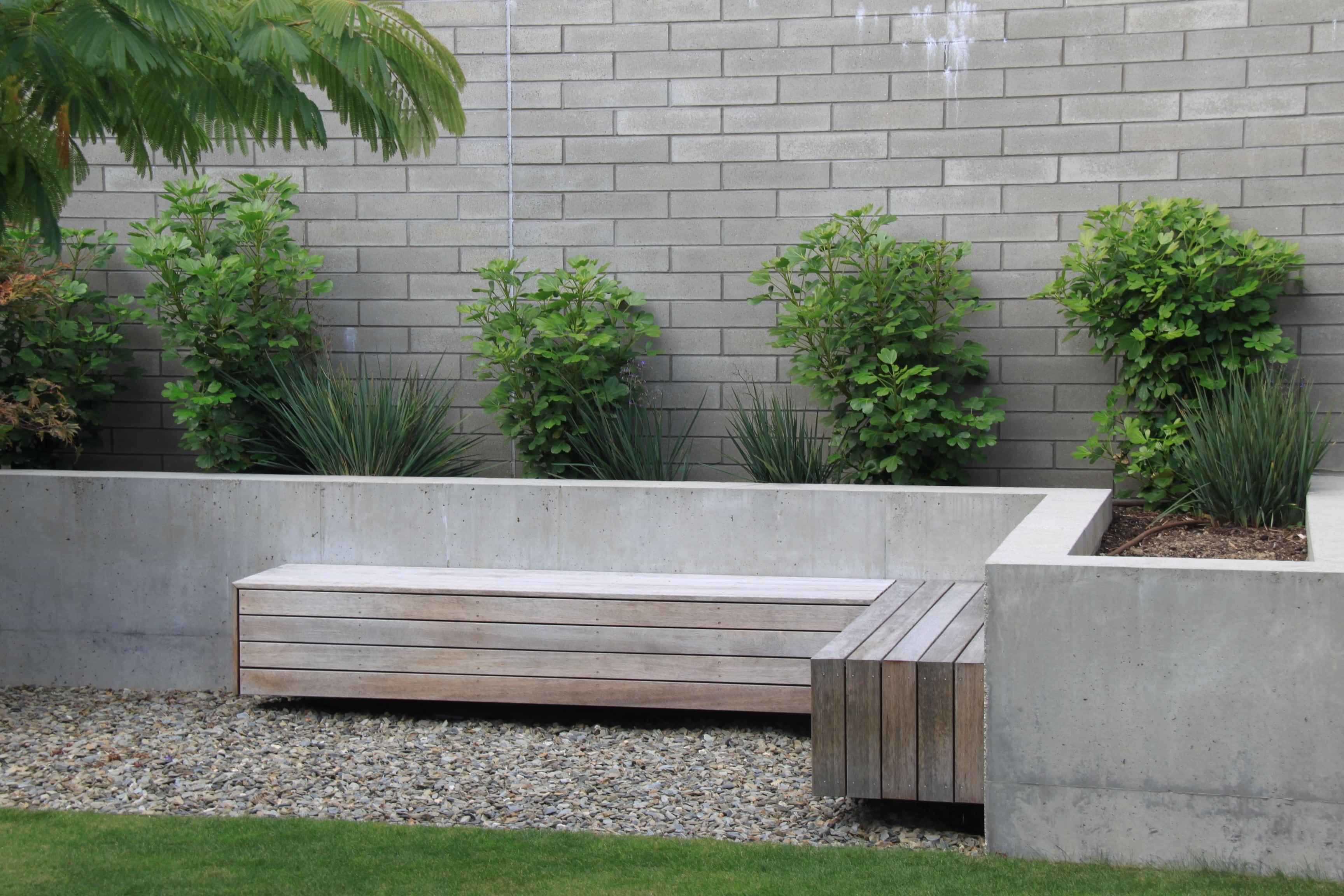 As a design response the slope was broken up between a board formed concrete planted area for privacy and a set of floating steps through a dry tolerant garden. A carpark filled the space in between.